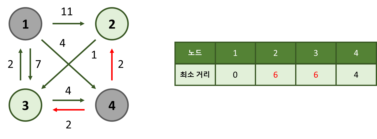 마찬가지로 3번 노드 역시, 이전 최소거리 7에서, 4 + 2 = 6이 더 작으므로 이로 업데이트 됩니다.