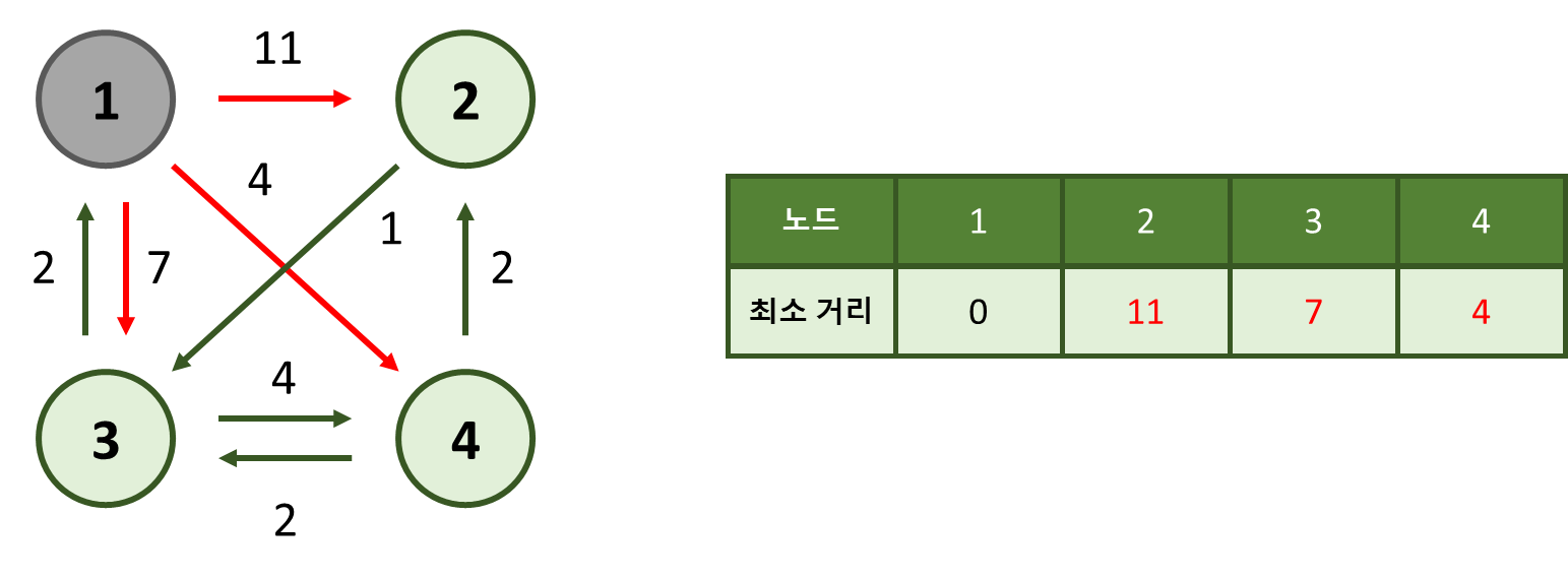 이제 1번 노드를 제외한 나머지 노드 중 최소 거리인 노드를 찾습니다.