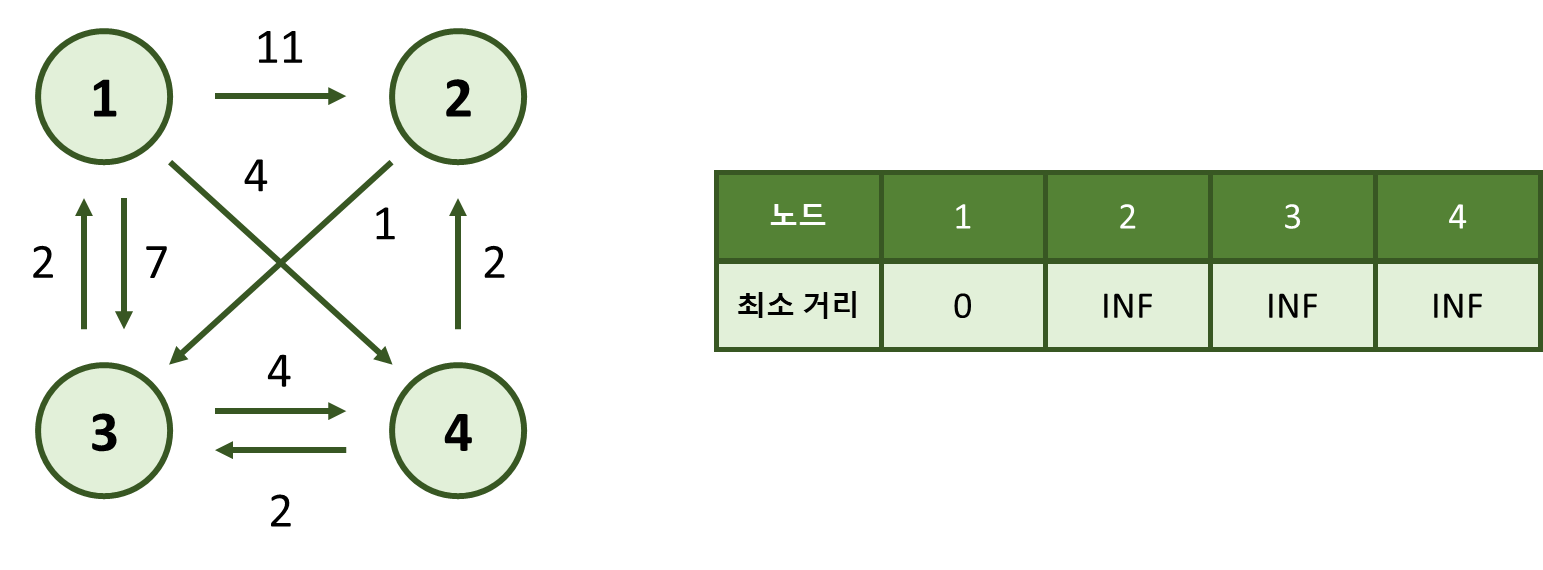 다익스트라는 시작점을 1개의 노드로 정하고 이 노드로부터 다른 모든 노드까지의 최단 거리를 구합니다.