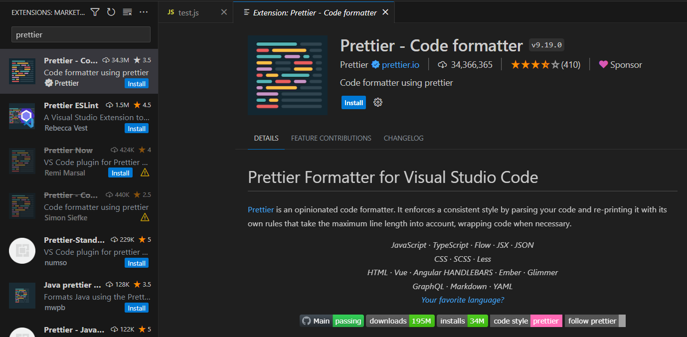 prettier 패키지 설치를 통한 설치