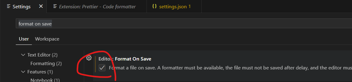 프리티어의 경우에는 검색창에 format on save를 검색해 체크해주자.