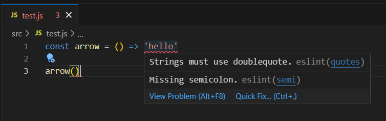 test.js를 만들어서 테스트해본 결과, eslint에서 정상적으로 에러를 표시해주는 모습이 보인다.