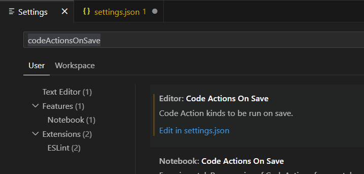 먼저, ESLint를 자동 적용하기 위해서는 검색창에 codeActionOnSave를 검색해준다.