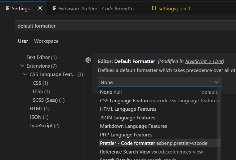플러그인으로 설치했다면, default formatter도 검색해 prettier로 설정해주자.