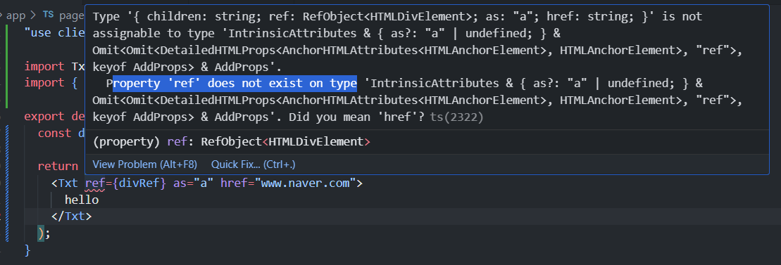 그런데 이제 TxtPropsType에 ref가 정의되어야하므로 ComponentPropsWithRef를 사용해준다.