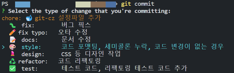 먼저 위 코드를 사용해 git-cz를 설치해준다.