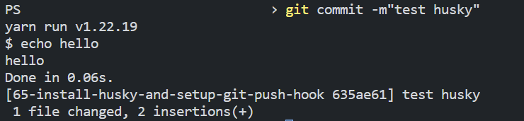 commit 시에도 husky가 test-hello 스크립트를 잘 실행하고 있음을 알 수 있다.