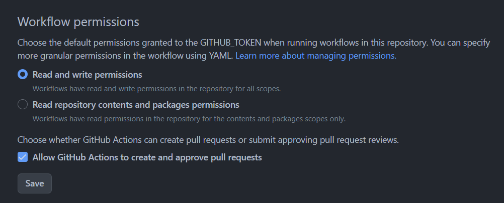 하단에 Allow Github Actions to create and approve pull requests도 체크해준다.