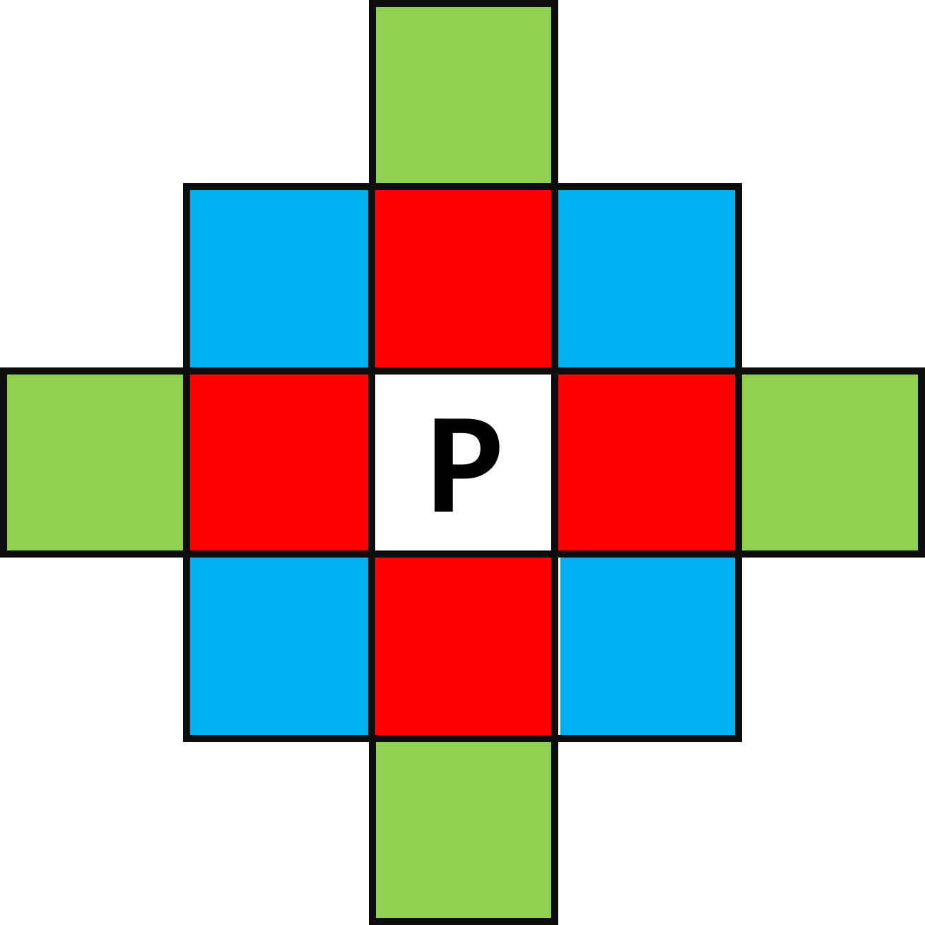 전체 행렬을 돌리면서 P가 나오면 P를 중심으로 색깔로 칠해진 영역을 조사한다.