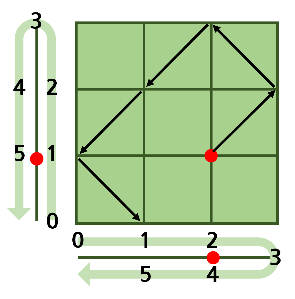 이 것이 각 가로나 세로보다 크다면(위 예제에서 3보다 크다면) 4, 5 부분이므로 따로 연산하여 위치를 구해주는 코드를 짰다.